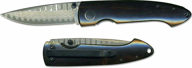 The illustrated Boker Knife is the Boker Plus Damascus Gent I Knife that features a 3 1/4″ drop point blade made of 67 layer Damascus steel. The blade of this Boker knife has dual thumb studs for ambidextrous one hand opening. The dark ebony wood handle, 3 3/4″ closed, has steel liners for strength, a liner lock and a lanyard hole. A discreet carry removable steel pocket clip is mounted at the pivot end of this Boker Knife. The Boker Plus Damascus Gent I Knife has an overall open length of 7 3/4″, and it weighs 2.1 ounces. Imported from China.