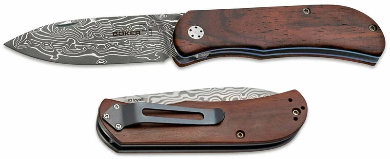 The illustrated Boker Knife is the Boker Plus Exskelibur II Knife, designed by Fred Burger and Mike Skellern, that features a 2 3/4″ drop point blade made of Damascus steel, with a nail nick for opening. The Cocobolo Wood handle, 3 3/4″ closed, has blue anodized titanium liners and liner lock. An end to end reversible titanium pocket clip is included with this Boker Knife. The Boker Plus Exskelibur II Knife has an overall open length of 6 1/2″, and it weighs 2 ounces. Imported from China.