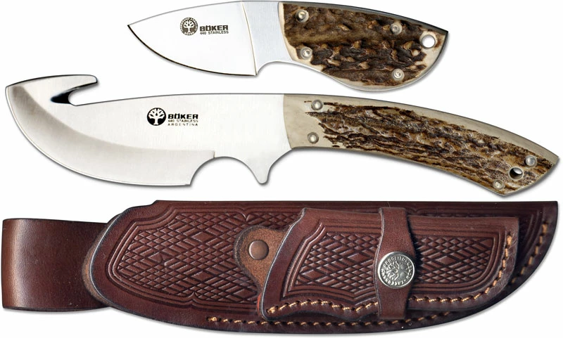 The illustrated Boker Knife Set is the Boker Hunting Knife Set that includes a gut hook knife and a caping knife. Each knife in this Boker Knife Set features a blade made of 440 stainless steel, full tang construction and genuine stag handle with lanyard hole. The Gut Hook knife has a blade length of 4 1/4″, an overall length of 8 1/2″, and a weight of 7 ounces. The Caping knife has a blade length of 2 1/4″, and an overall length of 5″. A genuine leather double pocket sheath is included with this Boker Knife Set. The Boker Hunting Knife Set with gut hook and caping knives is made in the Boker Arbolito facility; Buenos Aires, Argentina.