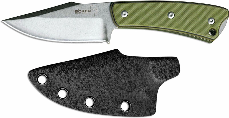 The illustrated Boker Knife is the Boker Plus Piranha Knife, designed by Scott McGhee, that features a 3″ clip point fixed blade made of 440C stainless steel. The blade of this Boker Knife has a stonewash finish and a top swedge. The Piranha Knife has full tang construction for strength; two tone OD G10 scales and a lanyard hole. A Kydex sheath with attachment is included with this Boker Knife. The Boker Plus Piranha Knife has an overall length of 6″, and it weighs 3.54 ounces. Imported from China.