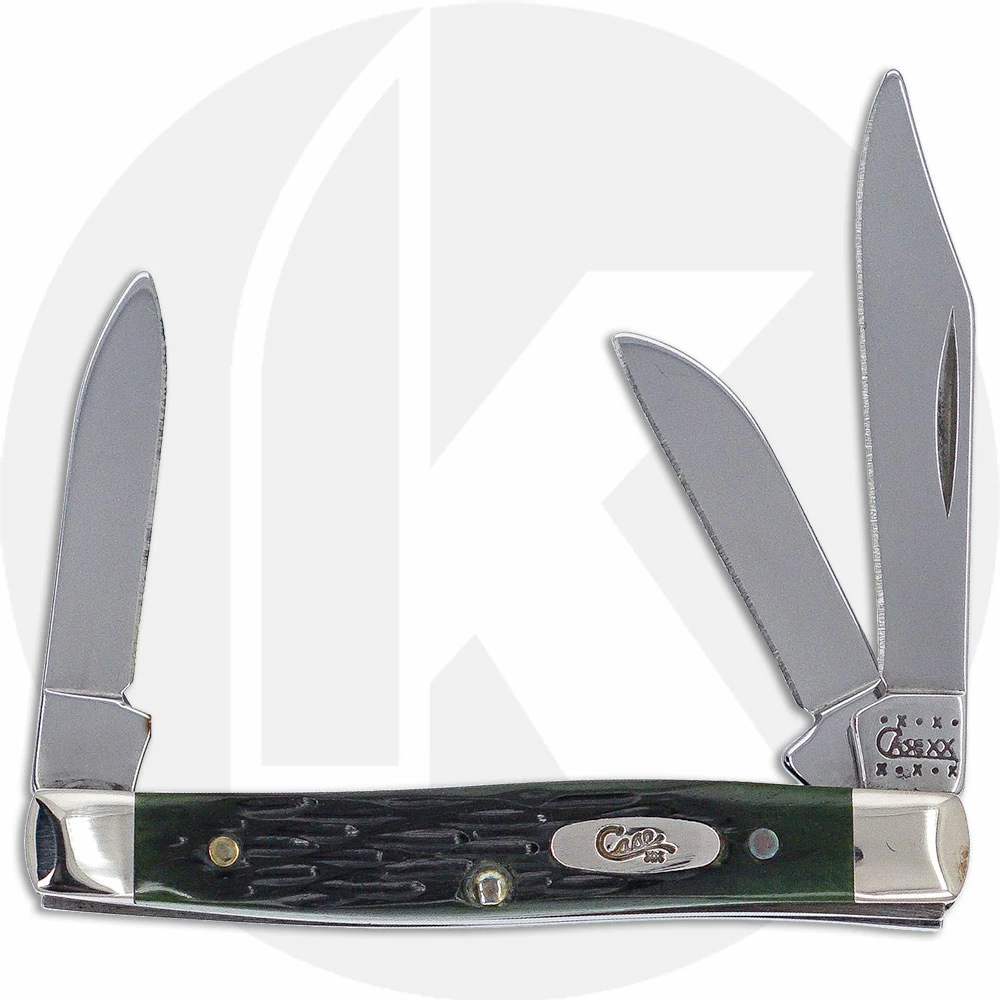 The 03507 Case Hunter Green (6333SS) Small Stockman Knife features clip, sheepfoot and pen blades made of mirror polished Tru-Sharp Surgical steel with nail nicks for opening. The jigged Hunter Green Bone handle, 2 5/8 inches closed, has the Case Oval Script Shield and nickel silver bolsters. The Case Small Stockman Knife weighs 1.4 ounces. Discontinued item, BNIB; made in the USA circa 2000.