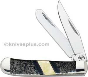 The 06402 Case Exotic Apache Gold (EX2154SS) Tiny Trapper Knife features clip and spey blades made of mirror polished Tru-Sharp Surgical steel with nail nicks for opening. The eye catching Apache Gold handle, 2 3/8 inches closed, has Gold Mother of Pearl, black stone and nickel silver inlays, and nickel silver bolsters. The Case Tiny Trapper Knife weighs 1.0 ounce. Discontinued item, BNIB; made in the USA in 2004.