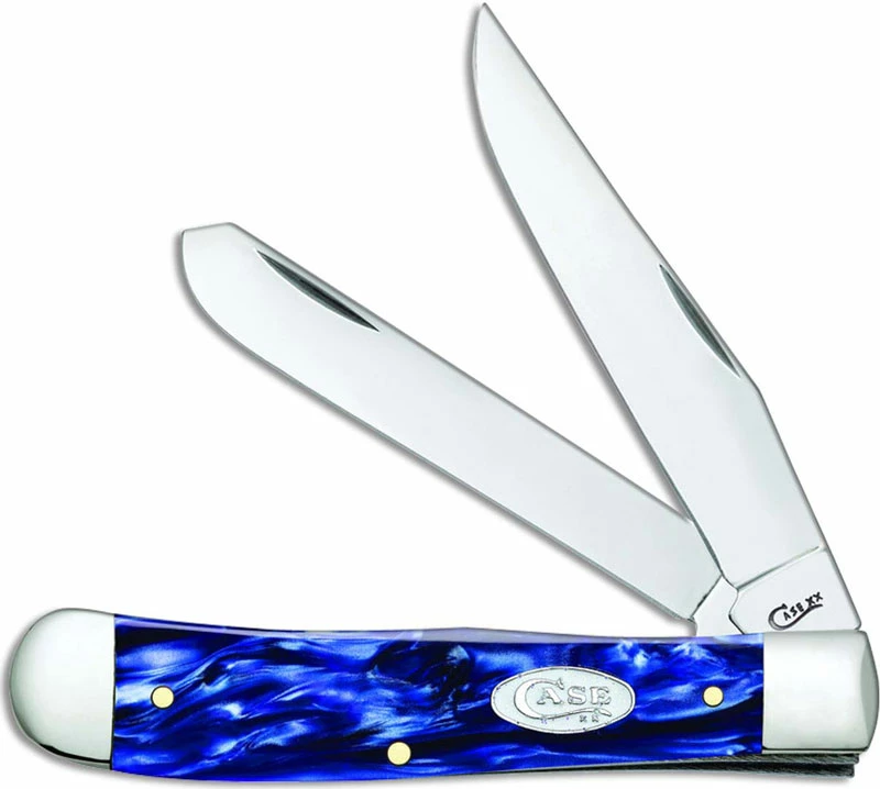 The 23431 Case Blue Pearl Kirinite (10254SS) Trapper Knife features clip and spey blades made of Tru-Sharp Surgical steel with nail nicks for opening. The Smooth Blue Pearl Kirinite handle of this Case knife, 4 1/8 inches closed, has the Case White Sparkle Oval shield and nickel silver bolsters. The Case Trapper Knife weighs 4.0 ounces. Made in the USA.