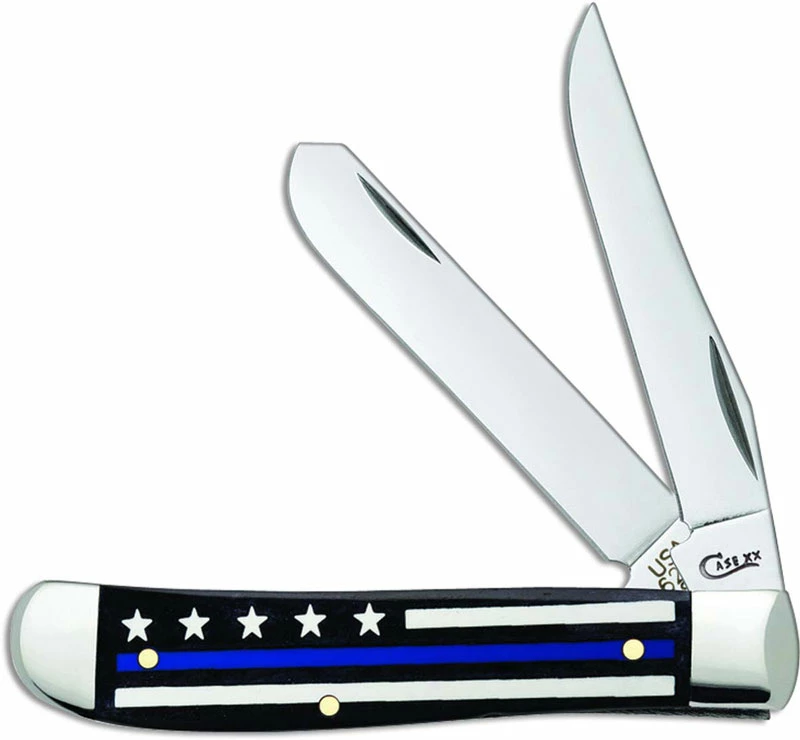 The Case Stripes of Service Series of knives is a tribute to first responders everywhere. The 06568 Case Stars of Service (6207SS) Mini Trapper Knife features clip and spey blades made of Tru-Sharp Surgical steel with nail nicks for opening. The Smooth Natural Bone handle of this Case knife, 3 1/2 inches closed, has Black, White and Blue Line color wash embellishment and nickel silver bolsters. The Case Mini Trapper Knife weighs 2.7 ounces. Made in the USA.