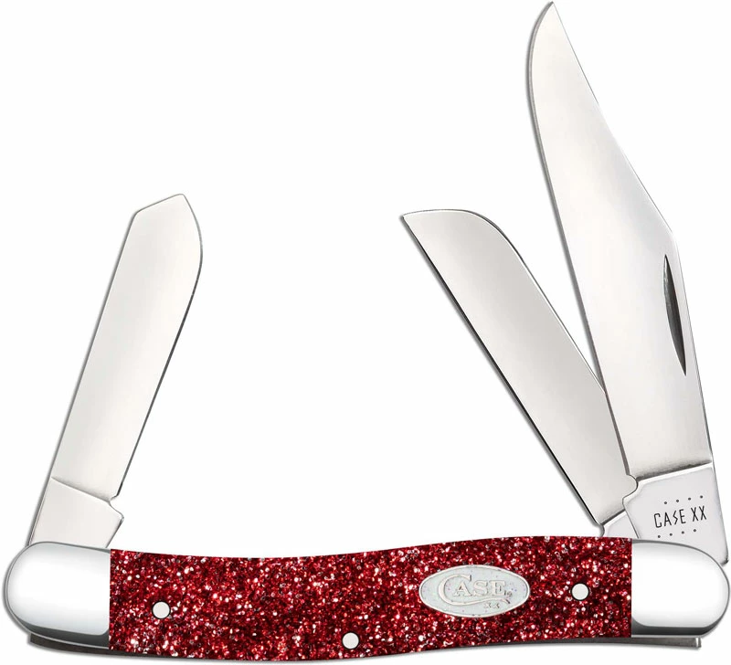 The 67001 Case Ruby Stardust Kirinite (10347SS) Stockman Knife features clip, sheepfoot and spey blades made of Tru-Sharp surgical stainless steel with nail nicks for opening. The eye catching Ruby Stardust Kirinite handle, 3 7/8 inches closed, has the Case White Sparkle Oval Shield, nickel silver components, and nickel silver bolsters. The Case Stockman Knife weighs 2.9 ounces. Made in the USA.