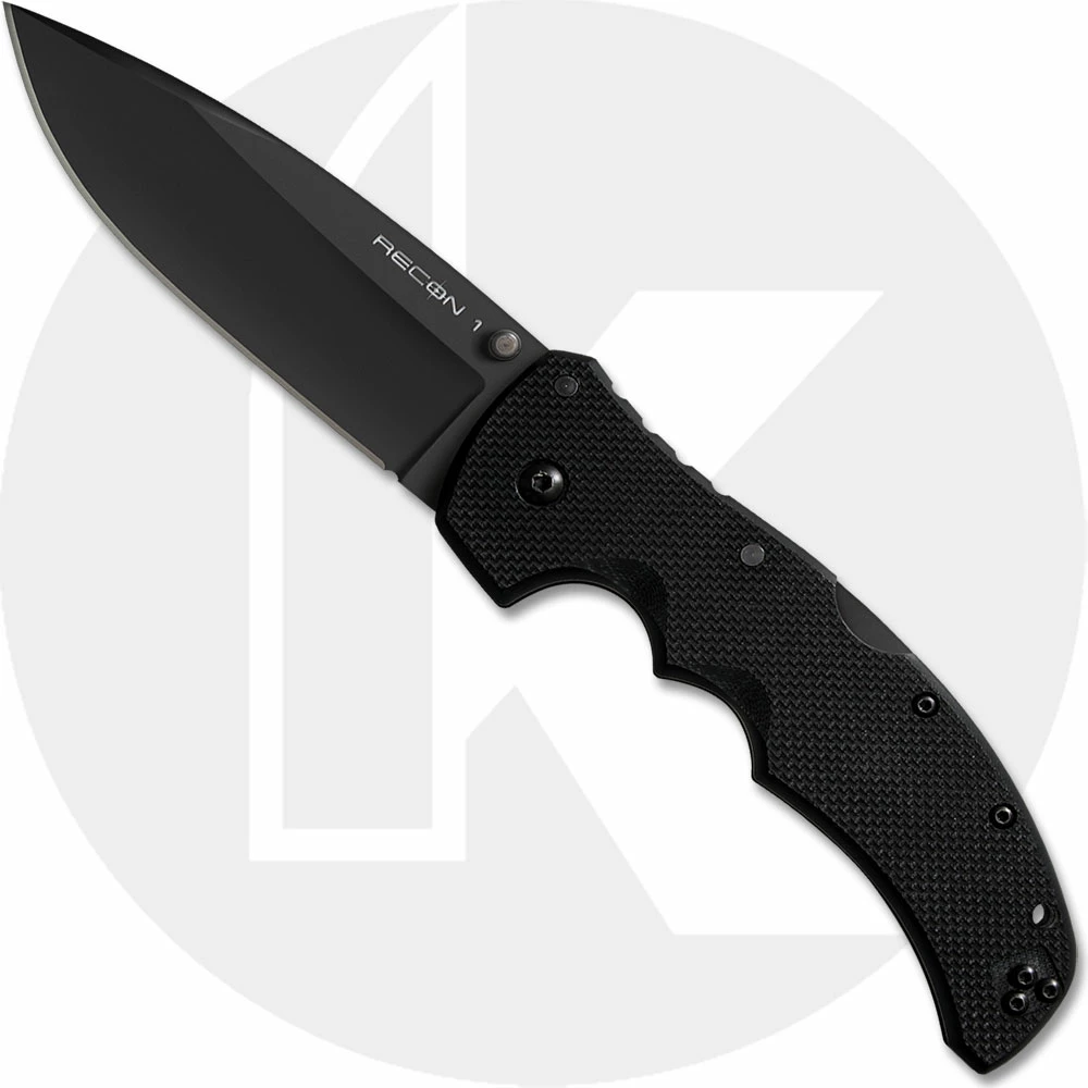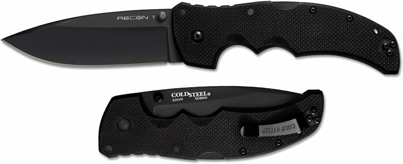 The Cold Steel Recon 1 with CPM S35VN blade steel! The 27BS Recon 1 Knife features a 4 inch spear point blade made of premium CPM S35VN stainless steel, 3.5mm thick, with a non reflective black DLC (Diamond Like Coat) finish, and dual thumb studs for ambidextrous one hand opening. The slim profile textured black G10 handle, 5 3/8 inches closed, has finger grooves for secure grip, sturdy Tri-Ad Lock, a lanyard hole, and ambidextrous pocket clip mounted at the butt end. The Recon 1 Knife with CPM S35VN steel blade has an overall open length of 9 3/8 inches, and it weighs 5.3 ounces. Made in Taiwan.