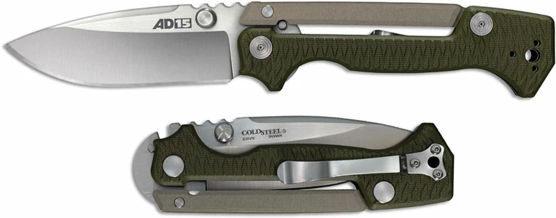 The 58SQ Cold Steel AD-15 Knife is an eyecatching tactical folder, designed by Andrew Demko, that features a 3 1/2 inch spear point blade made of premium S35VN stainless steel, 3.8mm thick. The blade has a saber grind with false top edge, a notched thumb rest for secure purchase, and dual thumb studs for ambidextrous one hand opening. The handle, 5 inches closed, has textured green G10 scales over steel liners for strength, a machined aluminum back with innovative Scorpion Lock and integral backspacer, a lanyard hole and an ambidextrous pocket clip mounted at the butt end. The Cold Steel AD-15 Knife has an overall open length of 8 1/2 inches, and it weighs 6.5 ounces.