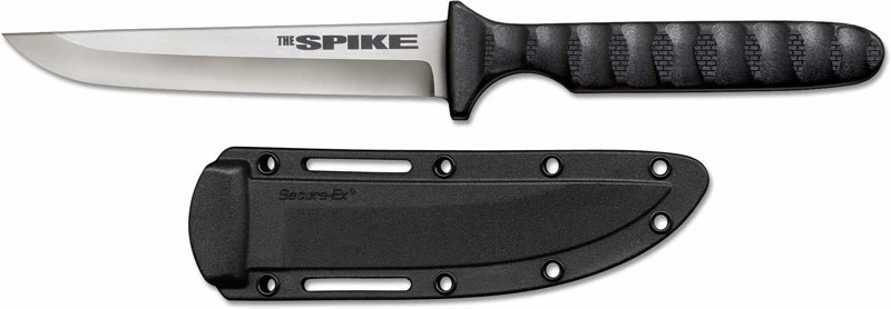 The illustrated Cold Steel knife is the Cold Steel Drop Point Spike knife that features a 4″ drop point fixed blade made of German 4116 stainless steel, 3mm thick. The black Griv-Ex handle of this Cold Steel knife has texture grooves for secure grip. A Secure-Ex neck sheath with bead chain lanyard is included with this Cold Steel knife. The Cold Steel Drop Point Spike knife has an overall length of 8″, and it weighs 2.3 ounces.