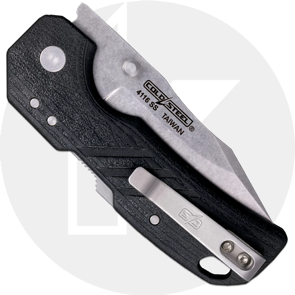 The FL-25DPLC Cold Steel Engage Knife, a compact workhorse from the Cold Steel Engage Series, features a 2.5 inch clip point blade made of 4116 stainless steel, 3mm thick, with a stonewash finish, top swedge to lessen weight, a sharpening choil, and dual thumb studs for ambidextrous one hand opening. The black GFN (glass filled nylon) handle, 3.50 inches closed, has ergonomic contours and grooves for secure, comfortable grip, a sturdy Atlas™ Lock, a lanyard hole, and a side to side reversible pocket clip mounted at the butt end. The Cold Steel Engage 2.5 has an overall open length of 6 inches, and it weighs 1.9 ounces. Made in Taiwan.