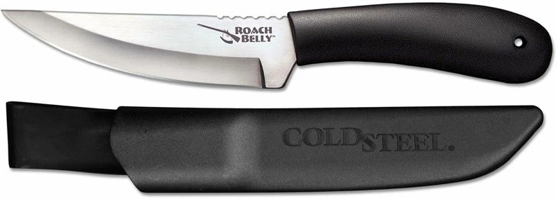 The illustrated Cold Steel knife is the Cold Steel Roach Belly Knife that features a 4 1/2″ blade made of German 4116 stainless steel, 2.5mm thick. The blade of this Cold Steel knife has a pronounced upswept curve, a sharp point, and a notched thumb rest for secure grip. The black polypropylene handle has a lanyard hole. A Secure-Ex sheath is included with this Cold Steel knife. The Cold Steel Roach Belly Knife has an overall length of 8 1/2″ and weighs 2.6 ounces.