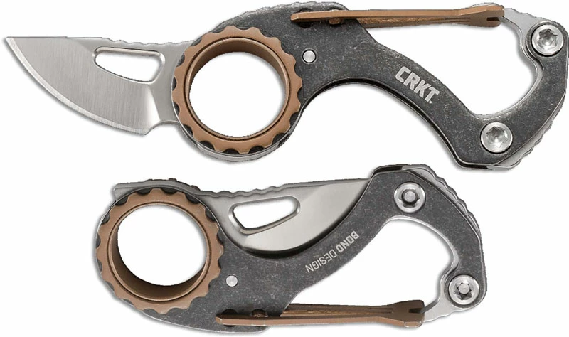 The 9082 CRKT Compano Knife, designed by Mike Bond of Pearl City, Hawaii, is a bare bones utility slip joint that features a 1.42 inch non locking trailing point blade made of 5Cr15MoV stainless steel, .14 inches thick, with a satin finish and a thumb hole. The skeletonized black stainless steel handle, 3.23 inches closed, has a finger hole for secure grip, a handy bottle opener and a carabiner gate attachment. The Compano Knife has an overall open length of 4.59 inches, and it weighs 2.20 ounces. Made in China.