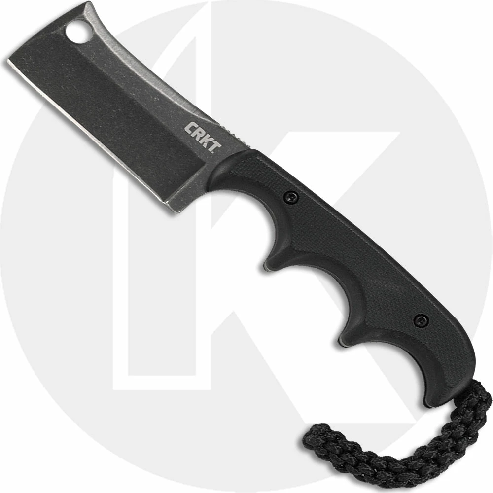 Latest in the popular Minimalist series of neck knives, designed by Alan Folts of Melbourne, Florida, the 2383K CRKT Minimalist Cleaver Blackout features a 2.13 inch cleaver style fixed blade made of 5Cr13MoV stainless steel, .10 inch thick. The blade has a non reflective black stonewash finish, swedged spine and hole to lessen weight, a swedged nose for safety in emergency situations, and a notched thumb rest for secure purchase. The Minimalist Cleaver Blackout has full tang construction for strength, finger grooves for secure grip, black G10 scales, and a braided fob. A black thermoplastic sheath with neck lanyard is included. The CRKT Minimalist Cleaver Blackout has an overall length of 5.06 inches, and it weighs 1.7 ounces; 2.3 ounces with the sheath. Made in China.
