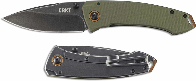 From the CRKT website: Built like a Bluefin. With a profile that suggests strong forward momentum and a blade shape that looks like a deep-sea carnivore, the Tunaâ„¢ everyday carry folding knife slices through packages and boxes faster than a Bluefin slices through the swell on a taut line.
