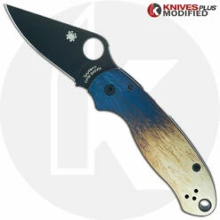 This MODIFIED Spyderco Para 3 Knife features a 3″ modified clip point blade made of CPM S45VN premium stainless steel with a non reflective black finish, a notched choil and thumb ramp for secure grip, and the Spyderco hole for ambidextrous one hand opening. The handles have been replaced with the KP Custom Titanium Scales with QUASAR Finish, 4.27″ closed, comes with a nested Compression Lock, a lined lanyard hole, and a side to side reversible tip-down steel pocket clip. The Spyderco Para 3 Knife has an overall open length of 7.27″, and it weighs 4.5 ounces. Made in the USA.