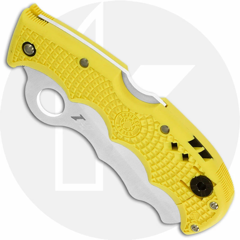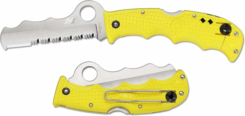 The illustrated Spyderco Knife is the Spyderco Assist Salt Knife that features a 3.68″ part serrated blade made of H-1 steel, .118″ thick. The blade of this Spyderco knife has a blunt safety tip, a hollow grind, a waved spine and the Spyderco hole for ambidextrous one hand opening. The yellow (FRN) fiberglass reinforced nylon handle, 4.87″ closed, has Bi-Directional Texturing and finger grooves for secure grip, a Boye Dent lockback, a recessed carbide glass breaker and an emergency whistle. A side to side reversible steel pocket clip is mounted at the butt end of this Spyderco Knife. The Spyderco Assist Salt Knife has an overall open length of 8.55″ and it weighs 3.9 ounces. Made in Japan.