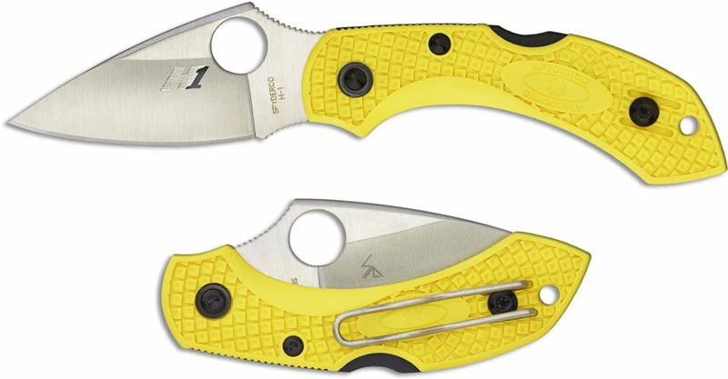 The illustrated Spyderco Knife is the Spyderco Dragonfly2 Salt Knife that features a 2.25″ leaf blade made of H-1 steel. The blade of this Spyderco knife has a notched thumb ramp and choil and the Spyderco hole for ambidextrous one hand opening. The Marine Yellow FRN (fiberglass reinforced nylon) handle, 3.33″ closed, has Bi-Directional Texturingâ„¢ for secure grip, a Boye Dent lockback and a lanyard hole. A side to side reversible wire pocket clip is mounted at the butt end of this Spyderco Knife. The Spyderco Dragonfly2 Salt Knife with plain edge blade has an overall length of 5.58″ and it weighs 1.2 ounces.