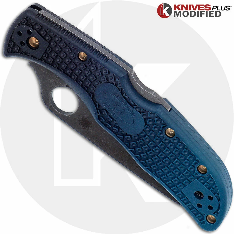 The MODIFIED Spyderco K390 Endela Lightweight Knife, a mid size EDC that ups the ante, features an ACID STONEWASHED 3.41 inch drop point blade made of Bohler-Uddeholm K390 tool steel, .118 inch thick, with a full flat grind, a thumb ramp for secure grip, and the Spyderco hole for ambidextrous one hand opening. The blue FRN (fiberglass nylon resin) handle has been given a black Rit Dye fade starting from the pivot. The dye steadily fades toward the acid stonewashed pocket clip which has also been heat colored. All hardware contrasts nicely with this bronze heat color. The MODIFIED Spyderco Endela Lightweight K390 Knife has an overall open length of 8.10 inches and it weighs 3.1 ounces. Made in Japan.