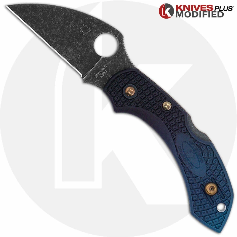 The MODIFIED C28FP2WK390 Spyderco Dragonfly 2 Lightweight K390 Wharncliffe Knife is a new iteration of a classic compact EDC that features an ACID STONEWASHED 2.28 inch Wharncliffe blade made of Bohler-Uddeholm K390 tool steel, .098 inch thick. The ACID STONEWASHED blade has a full flat grind, a notched thumb ramp for secure grip, and the Spyderco Hole for ambidextrous one hand opening. The blue FRN (fiberglass nylon resin) handle has been given a black Rit Dye fade starting from the pivot, which steadily fades toward the clip. The hardware / pocket clip contrasts nicely with our bronze heat color. The MODIFIED Spyderco Dragonfly 2 Lightweight K390 Wharncliffe Knife has an overall open length of 5.58 inches, and it weighs 1.2 ounces. Made in Japan.