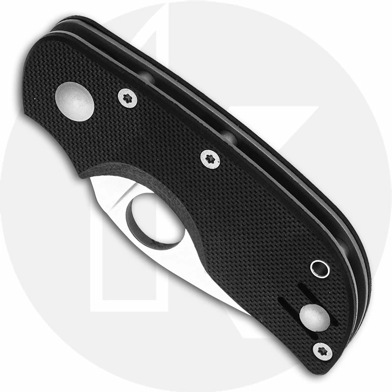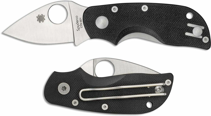 The illustrated Spyderco Knife is the Spyderco Chicago Knife that features a 2″ leaf shaped blade made of CTS BD1 stainless steel. The blade of this Spyderco knife has a flat grind and the Spyderco hole for ambidextrous one hand opening. The contoured black G10 handle, 3.11″ closed, has full length skeletonized steel liners for strength, the Michael Walker LinerLock® and a lanyard hole. A side to side reversible wire pocket clip is mounted at the butt end of this Spyderco Knife. The Spyderco Chicago Knife has an overall open length of 5.11″, and it weighs 2.2 ounces. Made in Taiwan.