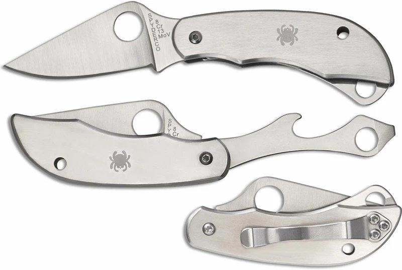The illustrated Spyderco Tool is the Spyderco ClipiTool with Bottle Opener and Screwdriver that features a 2″ non locking drop point blade made of 8Cr13MoV stainless steel, .079″ thick, and bottle opener with screwdriver tip. The blade of this Spyderco knife has a flat grind, and both the blade and bottle opener with screwdriver have a hole for easy opening. The contoured stainless steel handle, 2.57″ closed, has bug detailing and a lanyard hole. A removable steel pocket clip is mounted at the butt end of this Spyderco Tool. The Spyderco ClipiTool with Bottle Opener and Screwdriver has an overall open length of 4.57″ and it weighs 1.9 ounces. Made in China.