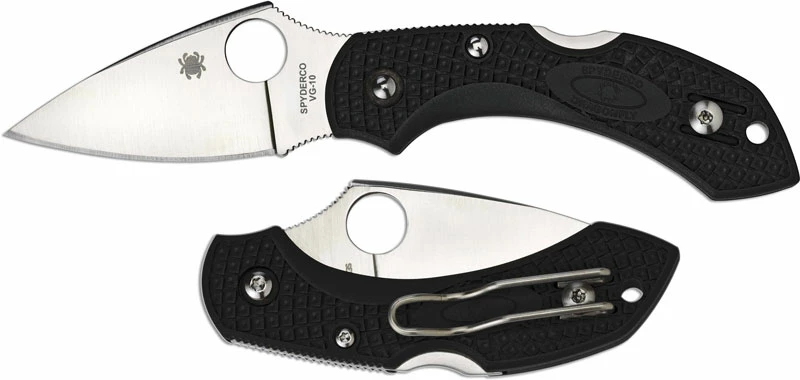 The illustrated Spyderco Knife is the Spyderco Dragonfly2 FRN Knife that features a 2.28″ leaf shaped blade made of VG10 stainless steel. The blade of this Spyderco Knife has a jimped choil and thumb ramp for secure grip, and the Spyderco hole for ambidextrous one hand opening. The contoured black fiber reinforced nylon handle, 3.3″ closed, has patented Bi-Directional Texturing, Boye dent lockback and a lanyard hole. A side to side reversible wire clip is mounted at the butt end of this Spyderco Knife. The Spyderco Dragonfly2 FRN Knife with plain edge blade has an overall open length of 5.61″ inches, and it weighs 1.2 ounces. Made in Japan.