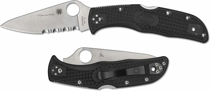 Unlike the standard expression of this model, the VG-10 stainless steel blade combines the low-friction edge geometry of a full-flat grind with the extreme cutting power of Spyderco serrations. It is also laser engraved with the motto “To Serve and Protect” to honor the service and sacrifice of law enforcement professionals.