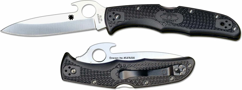 The illustrated Spyderco Knife is the Spyderco Endura 4 Wave Knife that features a 3.8″ modified drop point blade made of VG10 stainless steel. The blade of this Spyderco knife has a notched thumb ramp and a Wave for ambidextrous one hand opening and for open on withdrawal. The dark gray fiberglass reinforced nylon handle, 4.98″ closed, has a Volcano Grip texture and a Boye dent lockback. A side to side and end to end reversible black metal pocket clip is included with this Spyderco knife. The Spyderco Endura 4 Wave Knife has an overall length of 8.78″ and weighs 3.6 ounces.