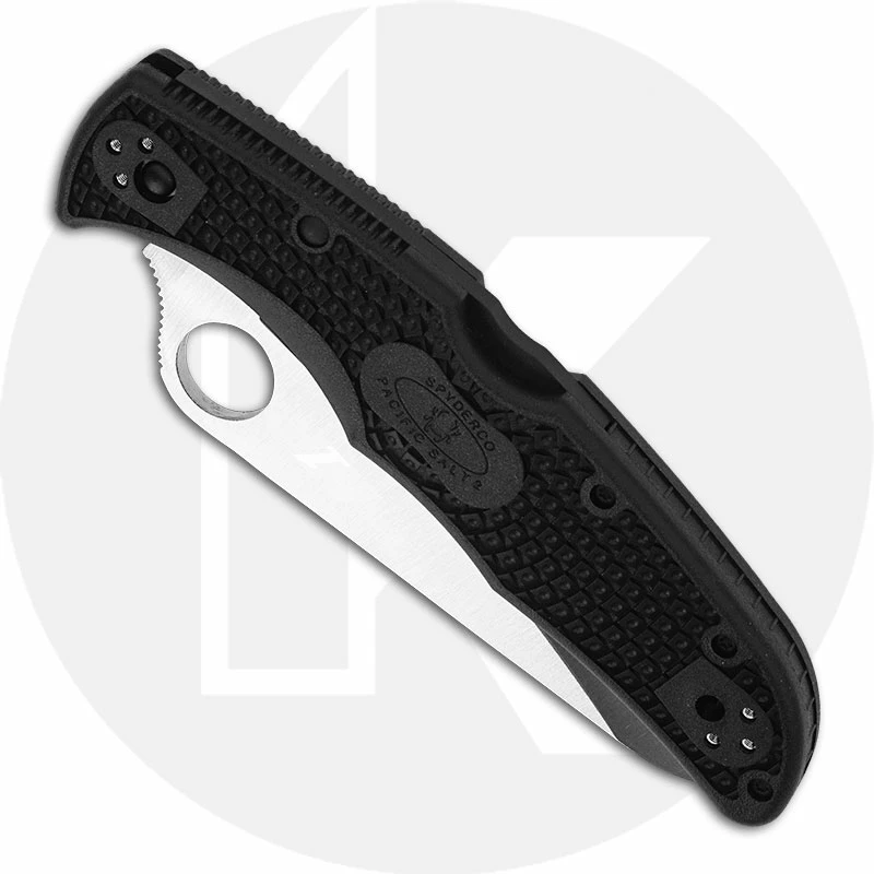 The C91PBK2 Spyderco Pacific Salt 2 features a 3.78 inch drop point blade made of ultra corrosion resistant H-1 steel, .114 inch thick, with a satin finish, a hollow grind, a notched thumb ramp for secure grip, and the Spyderco hole for ambidextrous one hand opening. The black FRN (fiberglass reinforced nylon) handle, 4.98 inches closed, has Bi-Directional Texturing for secure purchase, sturdy lockback, lanyard hole, and a side to side and end to end reversible pocket clip. The Spyderco Pacific Salt 2 Knife has an overall open length of 8.72 inches and it weighs 2.9 ounces. Made in Japan.