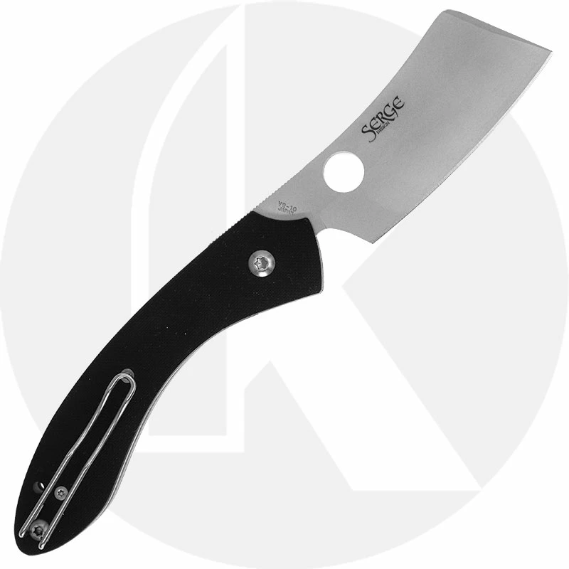 The illustrated Spyderco Knife is the Spyderco Roc Knife, designed by Ukrainian born knifemaker Serge Panchenko, that features a 3.07″ cleaver style blade made of VG10 stainless steel, .118″ thick. The blade of this Spyderco knife has a non reflective bead blast finish, a saber grind and the Spyderco hole for ambidextrous one hand opening. The contoured black G10 handle, 4.69″ closed, has skeletonized full liners for strength, the Walker LinerLock and a lanyard hole. A side to side reversible wire pocket clip is mounted at the butt end of this Spyderco Knife. The Spyderco Roc Knife has an overall open length of 7.76″ and it weighs 4.2 ounces. Made in Japan.