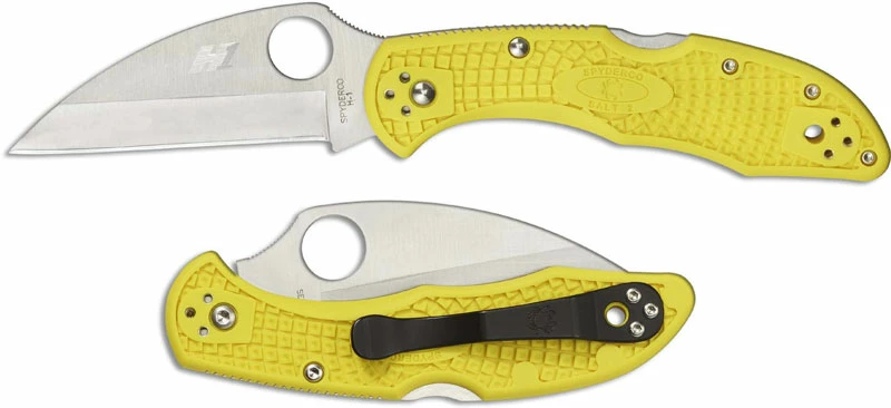 The C88PWCYL2 Spyderco Salt 2 Knife features a 2.89 inch Wharncliffe blade made of rust proof nitrogen based H-1 steel, .098 inches thick, with a hollow grind, a notched thumb ramp for secure grip, and the Spyderco Trademark Round Hole for ambidextrous one hand opening. The slim bright yellow FRN (fiberglass reinforced nylon) handle, 4.25 inches closed, has ergonomic contours and Bi-Directional Texture for secure purchase, a lockback, lanyard hole, and a 4 position titanium pocket clip. The Spyderco Salt 2 Wharncliffe Knife has an overall open length of 7.14 inches, and it weighs 2.0 ounces. Made in Japan.