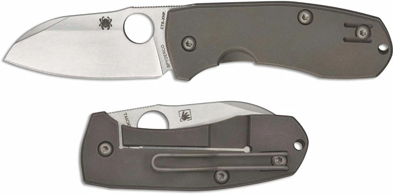 The C158TIP2 Spyderco Techno 2 knife is a slimmer version of the original Techno compact powerhouse, designed by Polish custom knifemaker Marcin Slysz, that features a 2.55 inch beefy sheepfoot blade made of CTS XHP stainless steel, .138 inches thick, with a high saber grind, a swedged tip, notched thumb rest for secure grip, and the Spyderco Trademark Round Hole for ambidextrous one hand opening. The matte titanium handle, 3.44 inches closed, has the sturdy R.I.L. Reeve Integral Lock, color anodized standoffs, a lanyard hole, and a side to side reversible wire clip mounted at the butt end. The Spyderco Techno 2 Knife has an overall open length of 5.99 inches, and it weighs 3.4 ounces. Made in Taiwan.