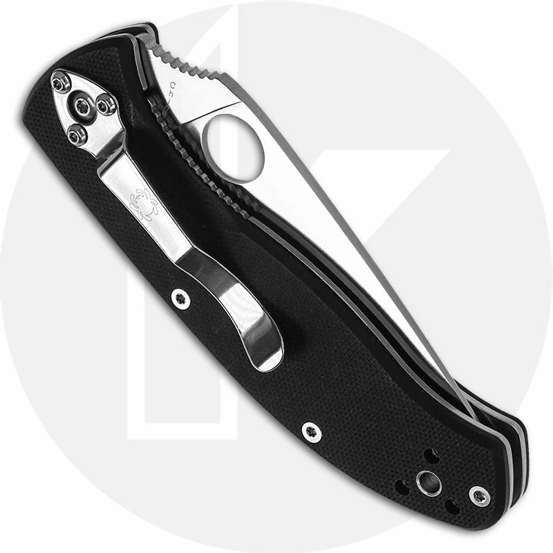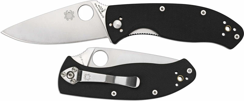 The illustrated Spyderco Knife is the Spyderco Tenacious Knife that features a 3.39″ drop point blade made of 8Cr13Mov stainless steel. The blade of this Spyderco knife has an enlarged Spyderco hole for ambidextrous one hand opening, and a notched thumb ramp. The contoured black G10 handle, 4.38″ closed, has full skeletonized steel liners, jimped Walker Linerlock and a lined lanyard hole. A side to side and end to end reversible metal pocket clip is included with this Spyderco knife. The Spyderco Tenacious Knife has an overall length of 7.77″ and weighs 4 ounces.
