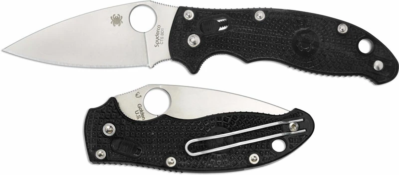 The illustrated Spyderco Knife is the Spyderco Manix2 Lightweight Knife that features a 3.37″ drop point blade made of CTS BD1 stainless steel, .125″ thick. The blade of this Spyderco knife has a full flat grind, a notched thumb ramp and choil for secure grip, and the Spyderco hole for ambidextrous one hand opening. The textured black FRCP (fiberglass reinforced co polymer) handle, 4.66″ closed, has an encased Ball Bearing Lock and an oversized lanyard hole. A side to side reversible wire pocket clip is mounted at the butt end of this Spyderco Knife. The Spyderco Manix2 Lightweight Knife with black handle has an overall length of 8.03″ and it weighs 3 ounces. Made in the USA.