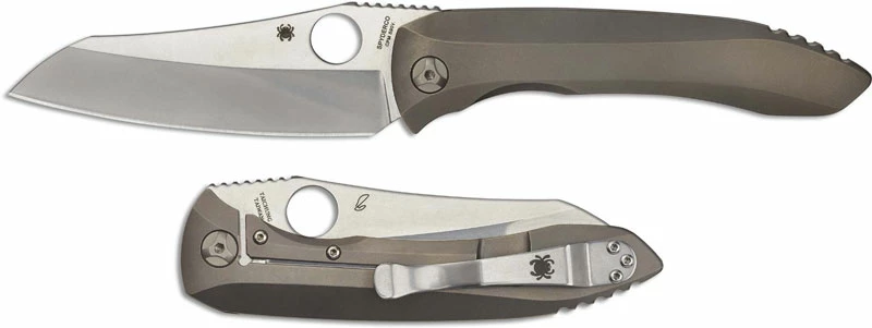 The C238TIP Spyderco Paysan knife is a sleek, primo everyday carry, designed by custom knifemaker Peter Rassenti, that features a 3.88 inch modified sheepfoot blade made of premium CPM S90V stainless steel, .157 inches thick, with a saber grind, a notched thumb rest for secure grip, and the Spyderco Trademark Round Hole for ambidextrous one hand opening. The single piece matte titanium handle, 4.86 inches closed, has Ball Bearing Washers for smooth opening, attractive milled contours, the sturdy R.I.L. Reeve Integral Lock with stainless steel interface / overtravel stop, and a removable steel pocket clip mounted at the butt end. The Spyderco Paysan Knife has an overall open length of 8.74 inches, and it weighs 4.4 ounces. Made in Taiwan.